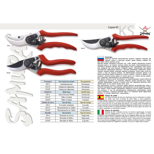 KS-8T Усиленный секатор с тефлоновым покрытием на лезвияхСекаторы Samurai одностороннего резания, идеально подходят для обрезки живых и растущих ветвей, делая обрезку стеблей или или малых веток намного легче.Верхнее лез... Читать далее...